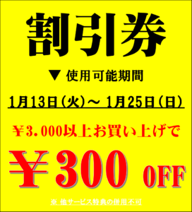 <1月14日(水)> ¥300 OFF! 割引券 大感謝SALE!チラシに付属の¥300 OFF 割引券は 1月25日(日)まで使用可能です。 是非、ご利用くださいませ♪ ※他、サービス、特典等との併用は不可です。