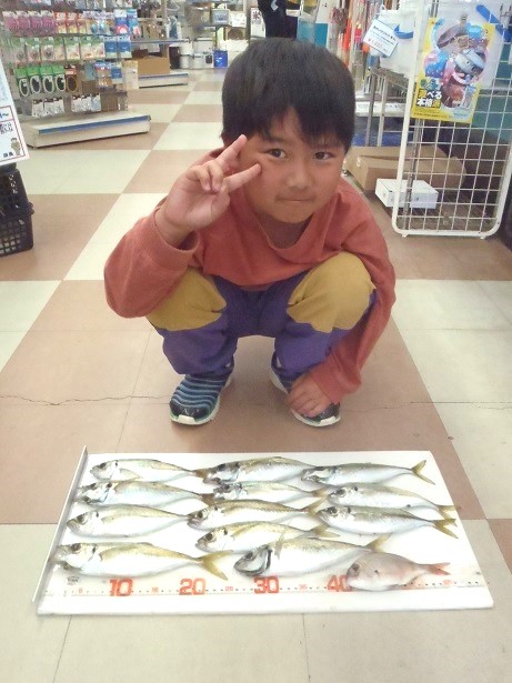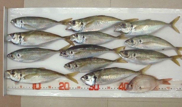10/19(日) 森本らんかちゃん・じん君中紀・田杭港にて、サビキ釣りでの釣果です🎣マアジの25㎝まで12匹とチャリコ