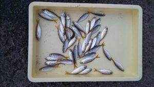 キビナゴ。平均サイズは指3本前後で時間帯は日暮れから2、3時間前後が狙い目です。