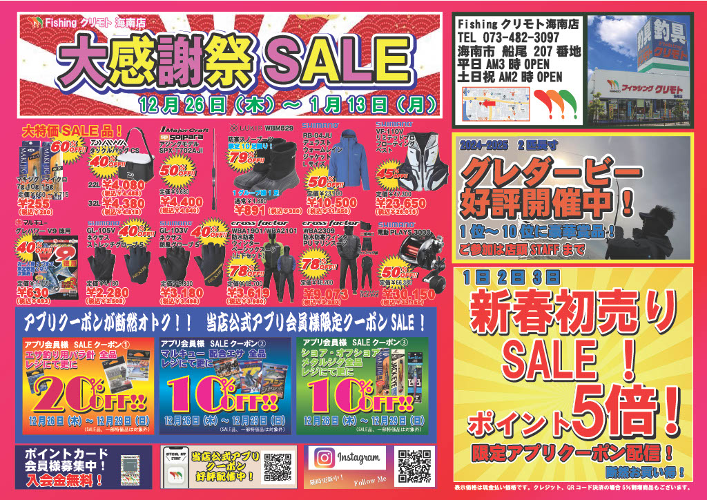 和歌山の釣具えさ専門店。チヌ・グレ・アオリイカ・太刀魚・ブラックバスなど釣果情報やお得情報満載