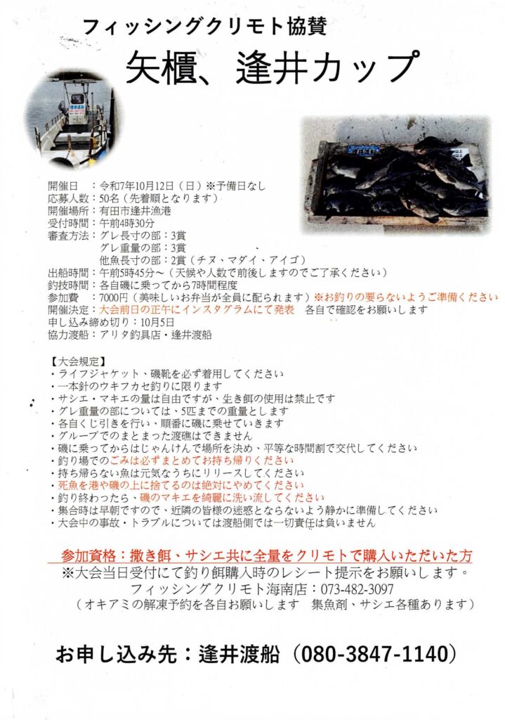 有田の矢櫃・逢井にてグレ釣り大会が開催されます!